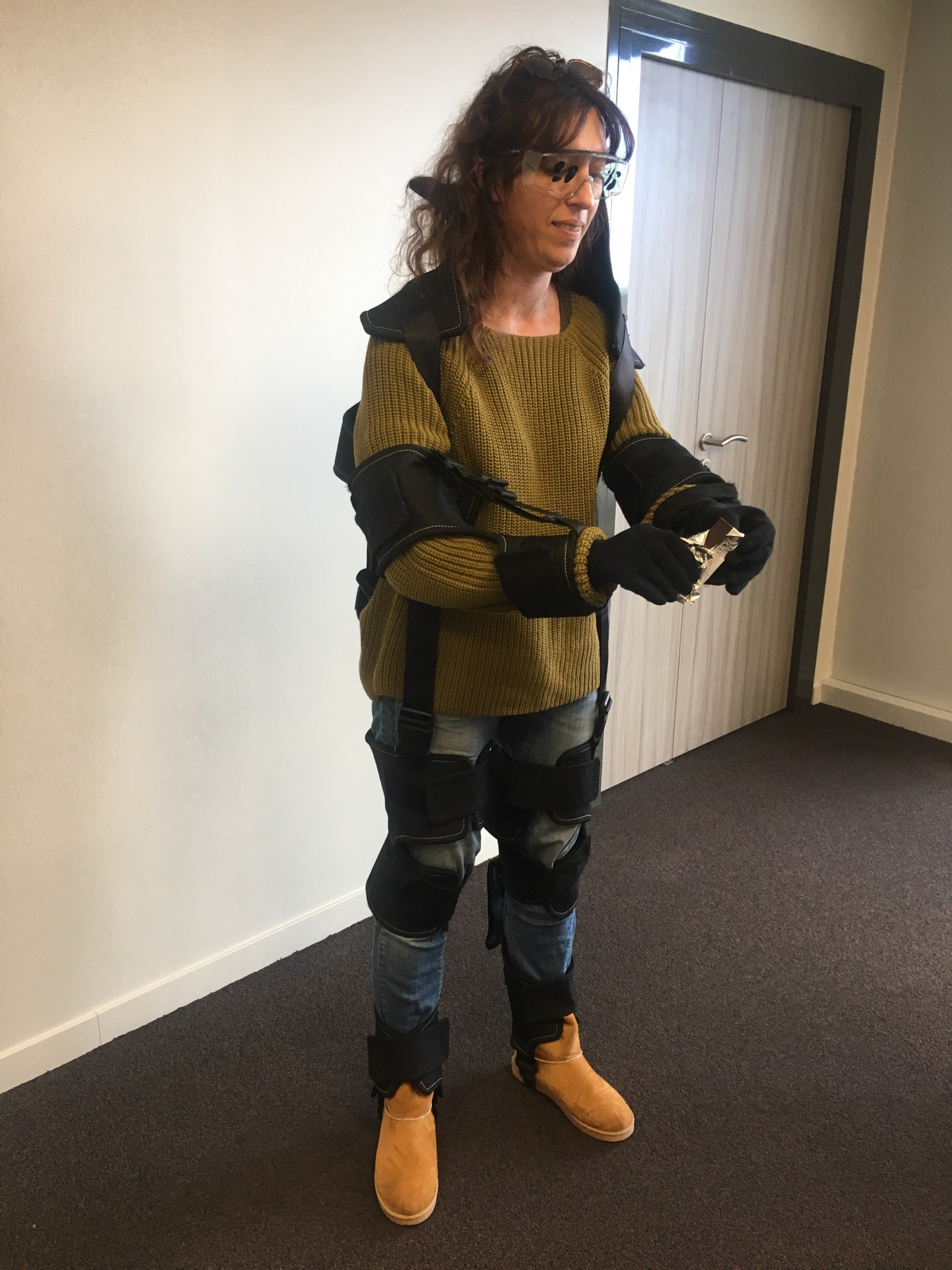 Cette combinaison, prêtée par notre partenaire le CLIC L’EPI et fournie par HEWI, restreint l’ensemble des mouvements; la colonne vertébrale est totalement raidie de même que les mains, les membres supérieurs et inférieurs. Les poids au niveau des chevilles et des poignets simulent la fonte musculaire et la lourdeur des membres. En outre, il est possible de porter des lunettes simulant le handicap engendré par une DMLA (dégénérescence maculaire liée à l’âge) ou par une cataracte.
